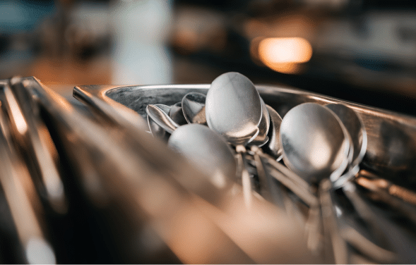 In unseren Besteckpoliermaschinen wird das Besteck durch eine spezielle UVC-Lampe sterilisiert. Die Besteckeinwickelmaschine wickelt die Bestecksätze automatisch in Serviettenpapier ein.- So bleiben die Besteckteile rundum geschützt, auch beim Transport zu verschiedenen Locations.